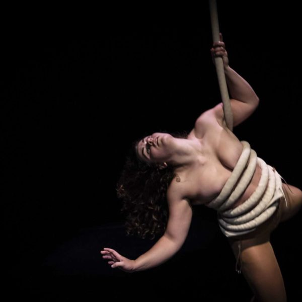 Corpomorphologistics is a performance on the border between contemporary circus and performance art. Combining language, soundscape, movement, and concept the artist enters the stage as the center of a question to the group: How do we see me? There is only one rope, only one body, and only one space...