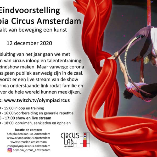Ter afsluiting van het jaar gaan we met de kinderen van circus inloop en talententraining een mooie eindshow maken. Maar vanwege corona kan er helaas geen publiek aanwezig zijn in de zaal. Daarom wordt er een livestream van de show uitgezonden via www.twitch.tv/olympiacircus, zodat familie en vriend...