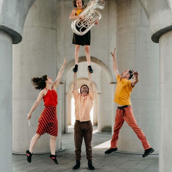 Acrobatische muziekvoorstelling over de zekerheid van vasthouden en het avontuur van loslaten.
