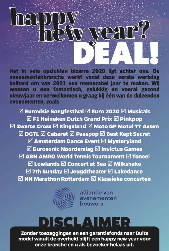 De Alliantie van Evenementenbouwers, waarin de organisatoren van publieksevenementen op het gebied van sport, cultuur en entertainment (waaronder Circuspunt) zich hebben verenigd, is klaar met het oude en tegelijkertijd klaar voor het nieuwe jaar. In een paginagrote advertentie kondigen zij een groot aantal events in 2021 aan, waarbij de organisatoren graag weer veel bezoekers ontvangen. Er is echter een grote disclaimer: toezeggingen en een garantiefonds naar Duits model vanuit de overheid, zijn onontbeerlijk.